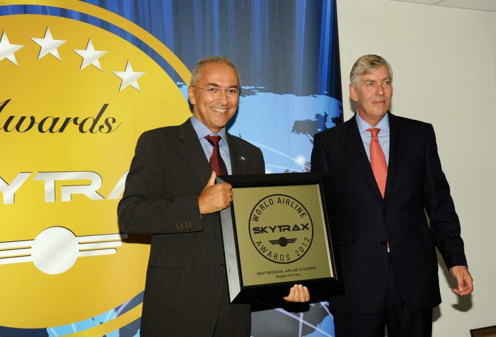 Dimitris Gerogiannis, CEO of AEGEAN AIRLINES receives Best Regional Airline Europe award from Edward Plaisted, CEO of Skytrax
